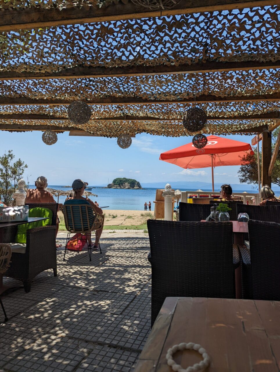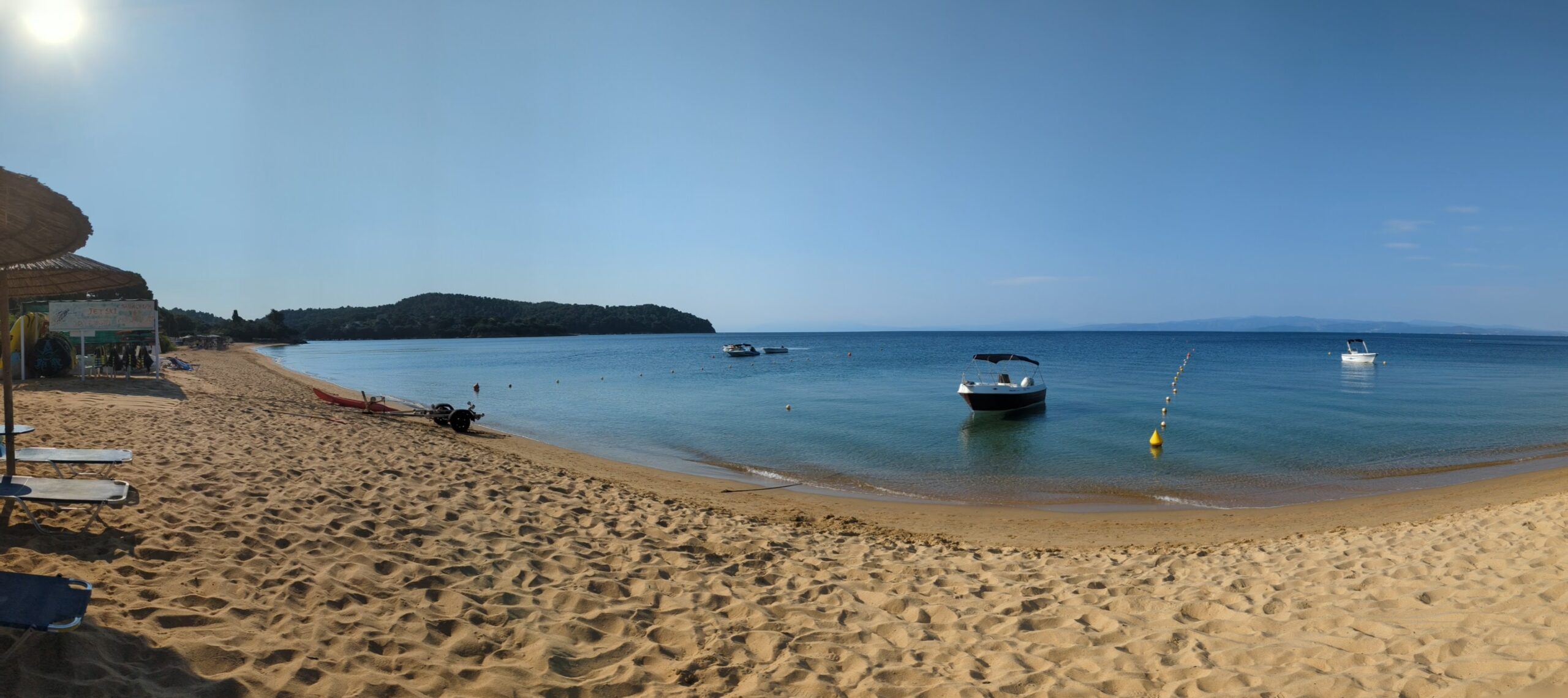The beach here is long and sandy, with the option of a kiosk for snacks and drinks or a short walk either along the beach or up to the main road to tavernas or mini market for those who fancy more options!