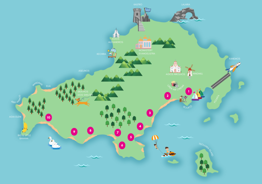 It’s easy to take a local bus to Skiathos town, or head to the beach to pick up a water-taxi. If you want to explore further south on the island hop on the bus and travel down towards Kolios, Platanias, Troulos or Koukounaries.