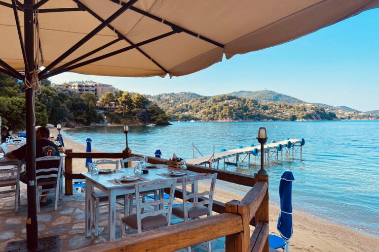 Tavernas line the beachfront, so you can easily pop for a lazy Greek lunch. Megali Ammos can get busy during high season since it’s popular with travellers who like the prospect of being able to walk into Skiathos Town.
